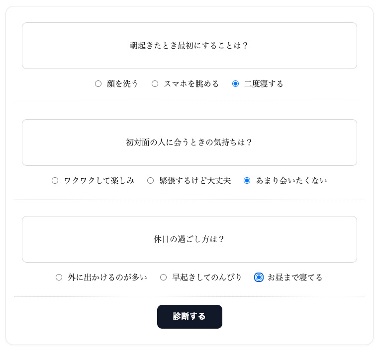いくつかの質問に答え、選択肢の「重み(点数)」の合計得点に応じて結果ページへ転送することができます。