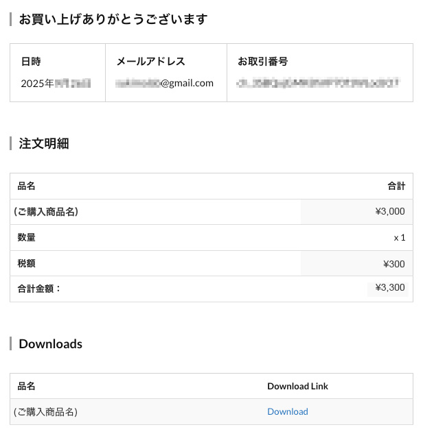 決済完了後、ダウンロードURLが記載されたレシートメールが送信されます。